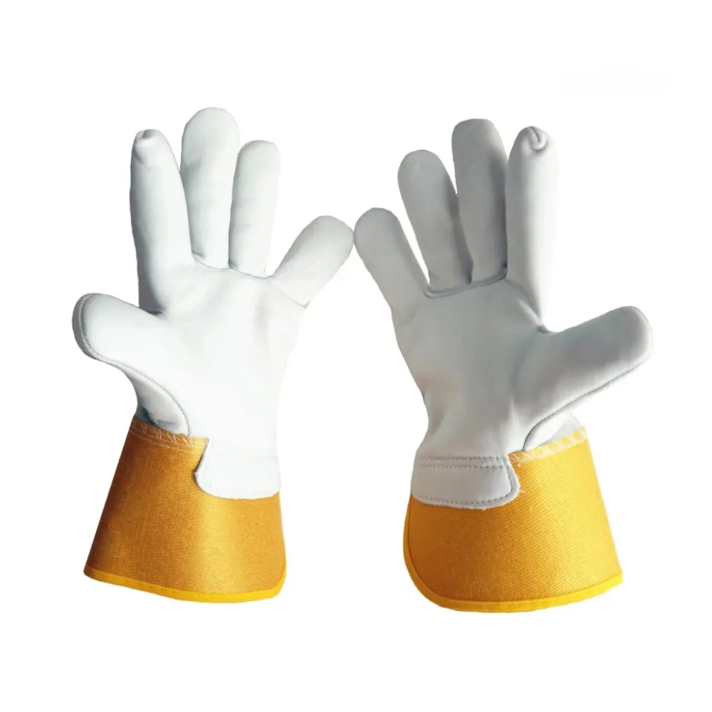 Перчатки TECRON™ 2017 для защиты от механических воздействий комбинированные, плотная смесовая ткань золотого цвета с кожей белого цвета, защитная крага, на запястье резинка. Перчатки обеспечивают высокий комфорт, и удобство манипулирования, высокий уровень защиты от истирания и разрыва, хорошие показатели защиты от пореза и прокола.