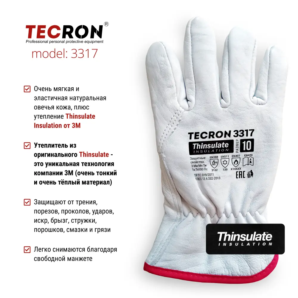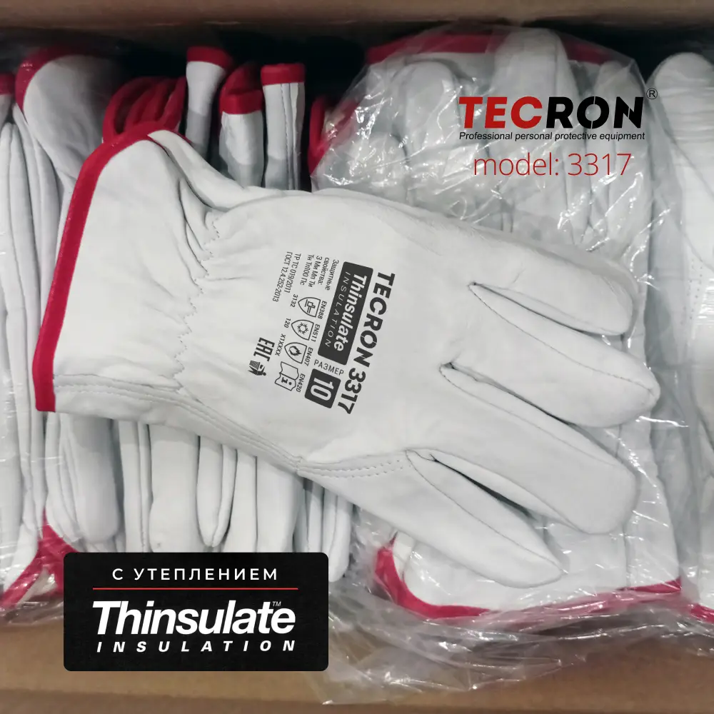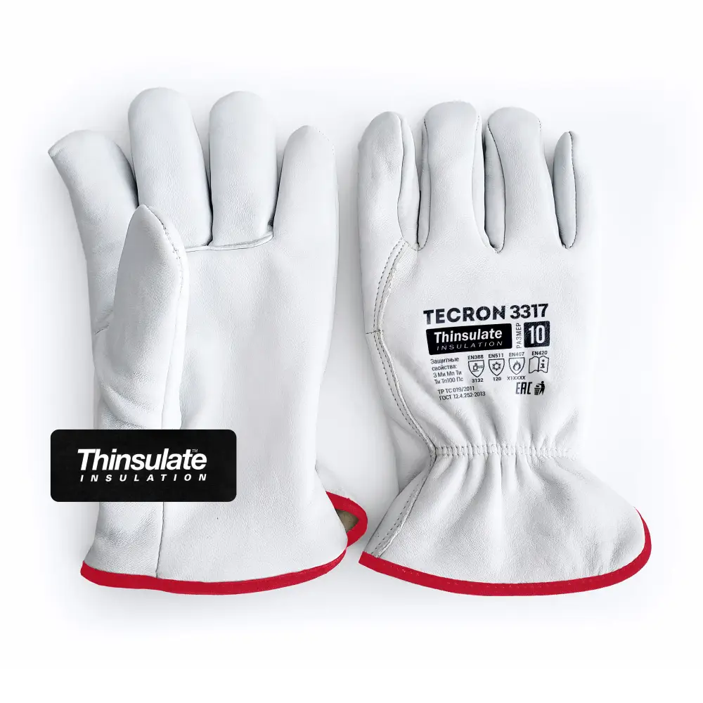 Кожаные перчатки из мягкой натуральной кожи TECRON™ 3317 с утеплителем из оригинального Thinsulate производства 3М защищают руки от механических воздействий, проколов и порезов, а также от искр, брызг расплавленного металла, порошков, грязи, химических загрязнений, металлической и иной стружки, смазки. Применяются в автомобильной промышленности, строительстве и ремонте, сельском хозяйстве, лесной промышленности.