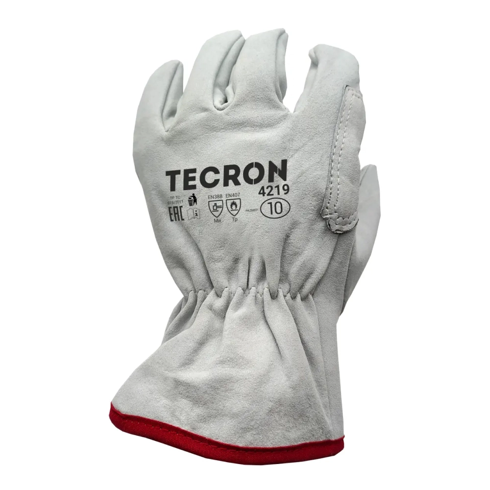 Спилковые перчатки TECRON™ 4219 cшиты из высококачественного спилка КРС белого цвета. Для лучшей фиксации на руке в манжет вшивается утягивающая резинка. Край манжеты обработан контрастной тесьмой.